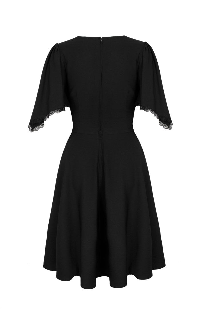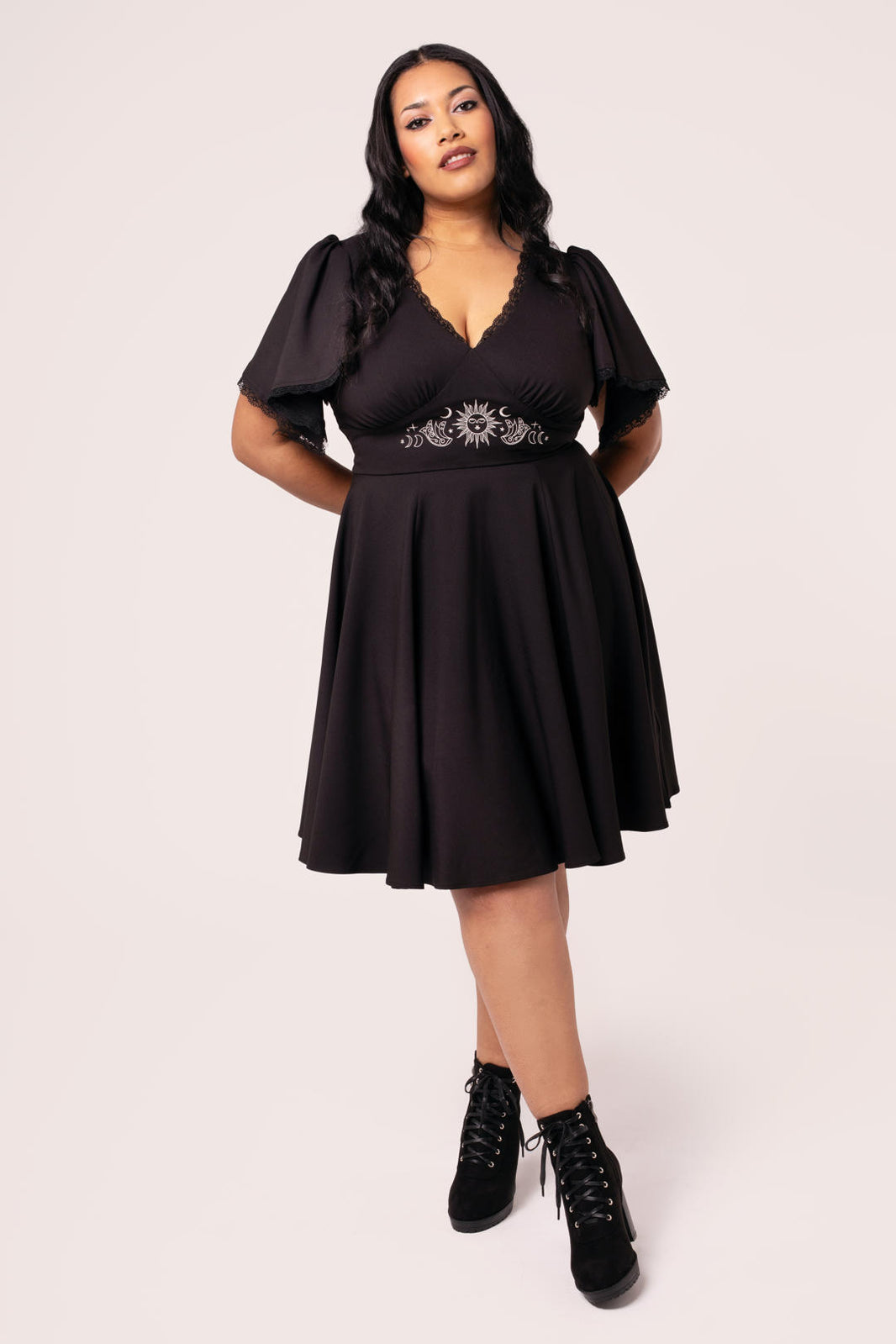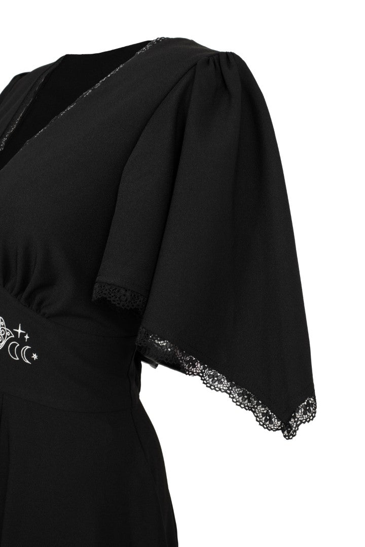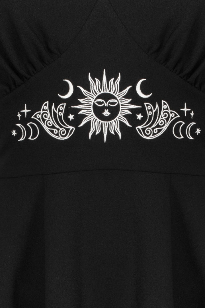 Add some mystery to the everyday with The Danica Dress. This midi dress is made from a bold black base, decorated with celestial, tarot-themed white embroidery along the waist and neckline..The V-neckline skims the chest, gathering into the fitted underbust waist panel. The skirt flares from the waist for added volume with a gathered panel at the hem for even more movement. Elegant draped sleeves are finished with lace trim, making The Danica Dress the most mystical addition to your wardrobe.